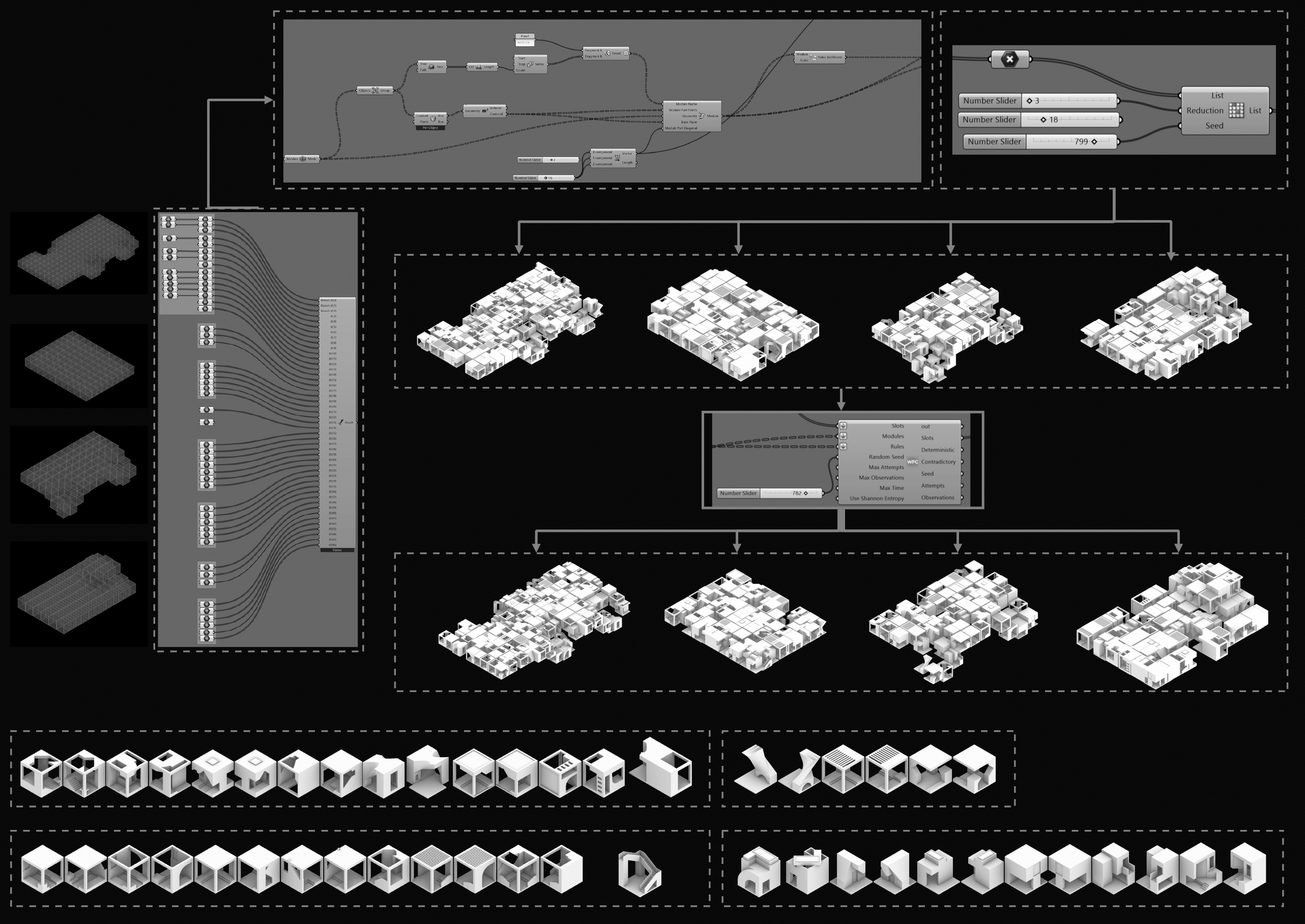 Using Grasshopper software, multiple models were generated and tested to explore various structural combinations. The generative logic of Grasshopper allowed for the flexibility to test hundreds of different configurations. This extensive testing process led to the selection of the most suitable design for the final solution. The project showcases the potential of combinatorial methods in architecture, demonstrating how they can be applied to create adaptive and resilient designs in flood-prone areas.